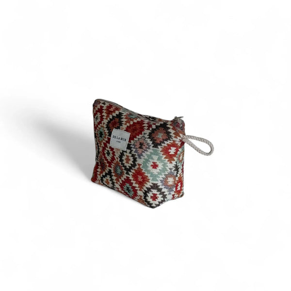 Deze Beauty Bag van de La Mur Line, ook wel toilettas of make-up tas genoemd, is uitgevoerd in een stevige jacquardstof met een fijn patroon van kleine ruitjes in roestbruin, rood-oranje, olijfgroen, beige en lichtblauw. Het geweven effect geeft het design extra diepte. Elk item kan variëren in patroon, afhankelijk van hoe het is uitgesneden.