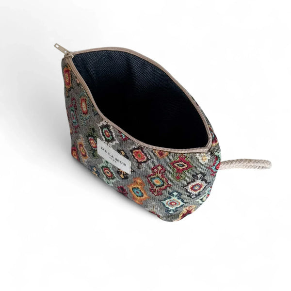 Deze Beauty Bag van de La Mur Line, ook wel toilettas of make-up tas genoemd, is uitgevoerd in een dikke jacquardstof met een ruitmotief in warme tinten zoals grijs, roest, donkergroen, oker en turquoise. Elk item kan variëren in patroon, afhankelijk van hoe het is uitgesneden.