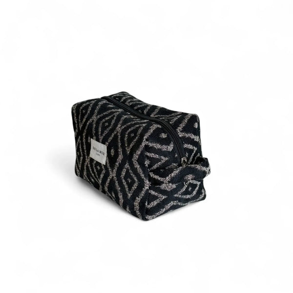 Deze Beauty Bag van de La Mur Line, ook wel toilettas of make-up tas genoemd, is uitgevoerd in een dikke jacquardstof met een beige, grafisch ruitpatroon op een diepzwarte achtergrond. Elk item kan variëren in patroon, afhankelijk van hoe het is uitgesneden.