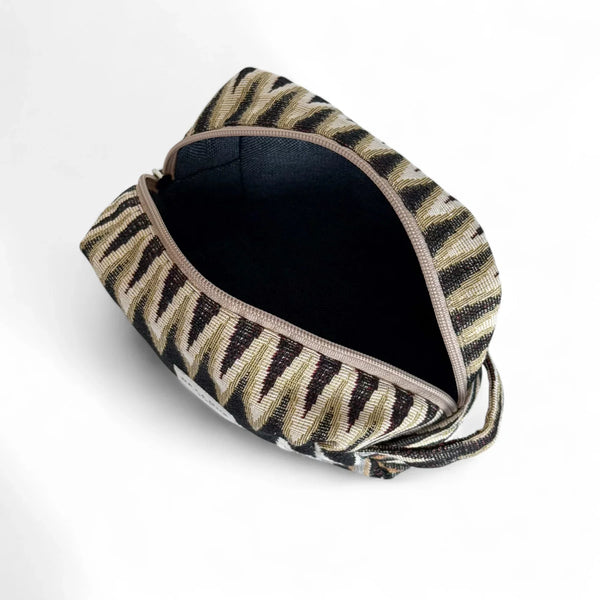 Deze Beauty Bag van de La Mur Line, ook wel toilettas of make-up tas genoemd, is uitgevoerd in een dikke jacquardstof met een zigzagpatroon in aardse kleuren als beige, bruin, zand en zwart. Elk item kan variëren in patroon, afhankelijk van hoe het is uitgesneden.