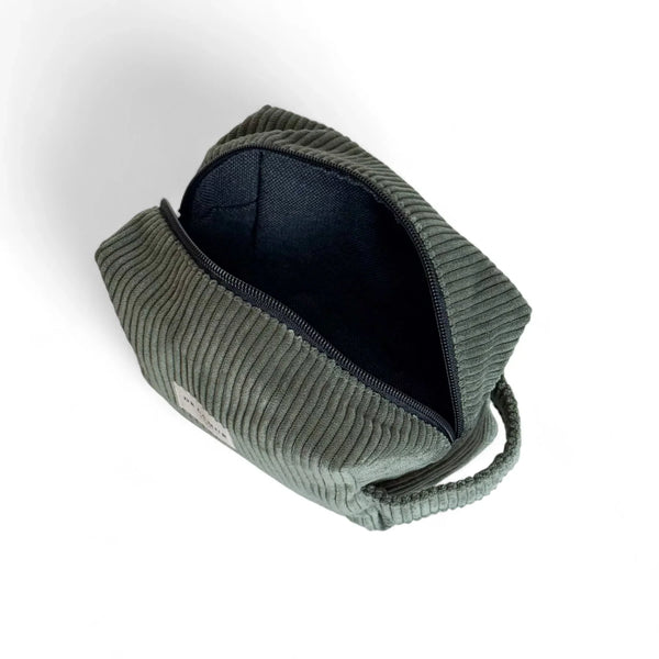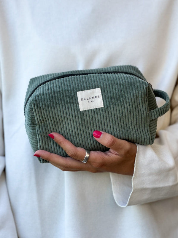 Deze Beauty Bag van de La Mur Line, ook wel toilettas of make-up tas genoemd, is uitgevoerd in een donkergroene corduroy ribstof.