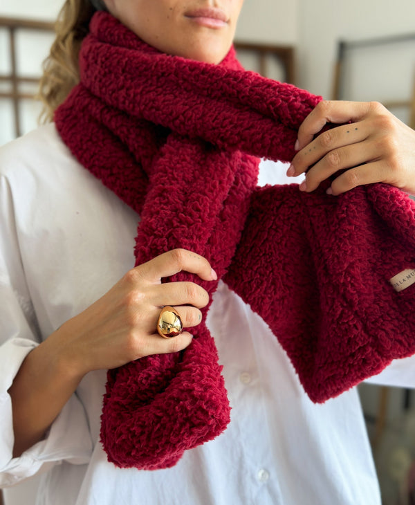 Deze doorsteeksjaal van de La Mur Line is uitgevoerd in een bordeauxrode teddystof.