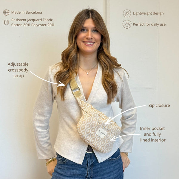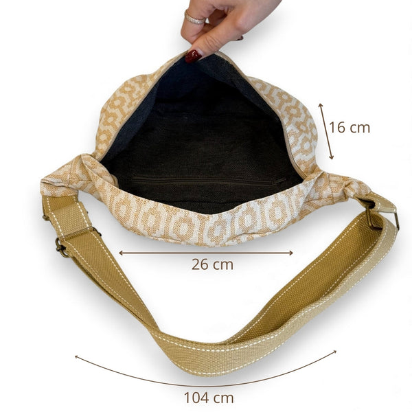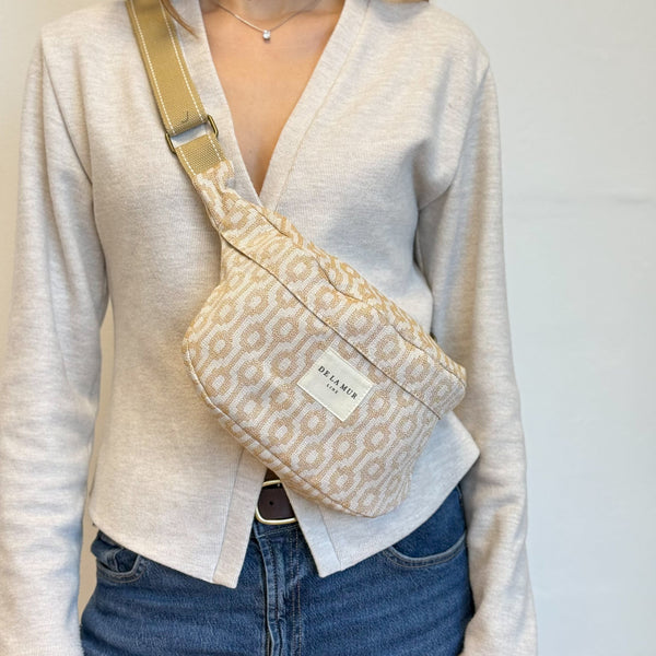 Dé musthave in je tassencollectie: de heuptas! Dit hippe heuptasje van de La Mur Line, ook wel fanny pack genoemd, is uitgevoerd in camelkleurige jacquardstof met een verfijnde geometrische print in crème.