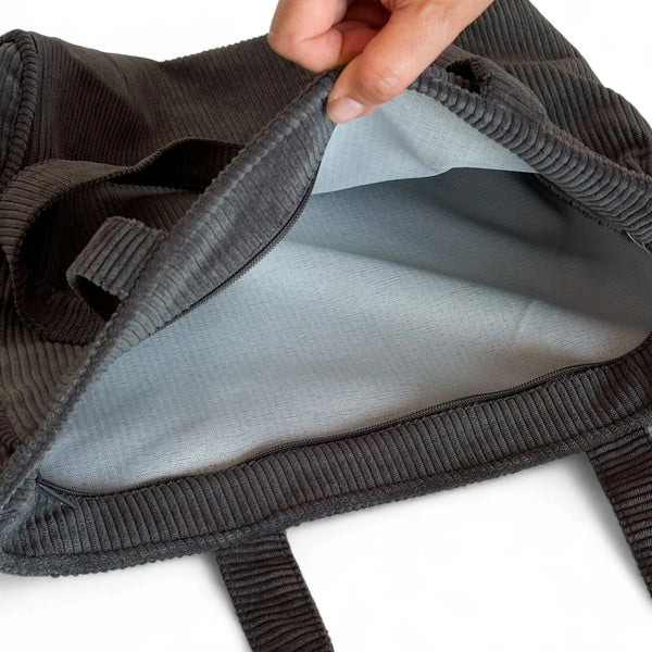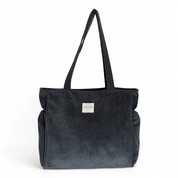 Deze rechthoekige Shopper van De La Mur Line is uitgevoerd in een antraciete corduroy ribstof.