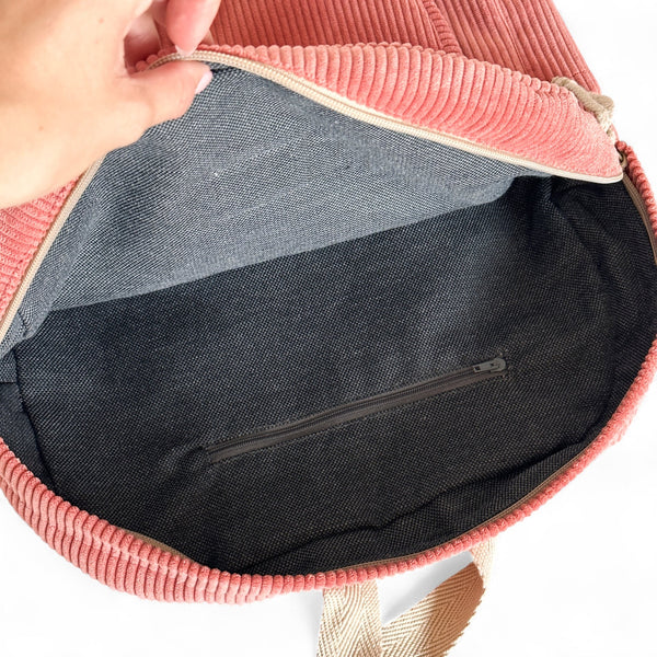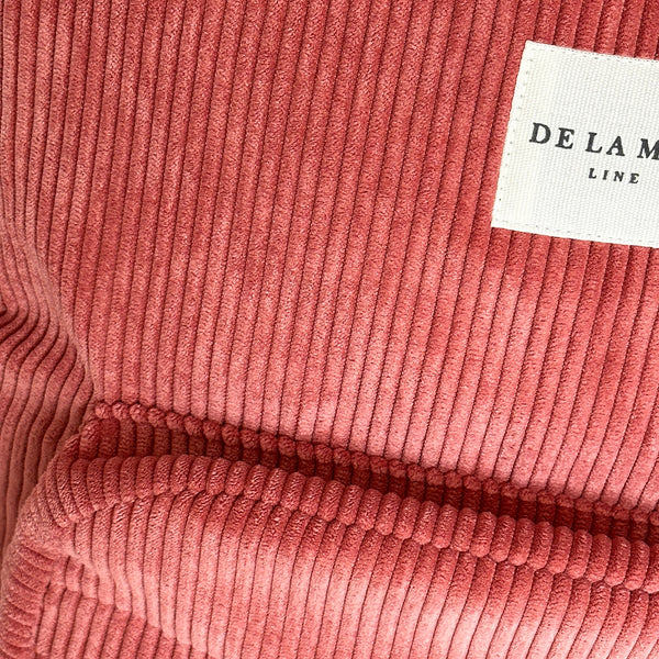 Deze stijlvolle rugzak van De La Mur Line is uitgevoerd in een koraalkleurige corduroy ribstof.