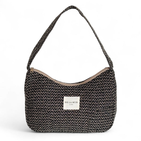 Deze kleine schoudertas van de La Mur Line is uitgevoerd in een dikke jacquardstof met een zigzagpatroon in zwart en beige.