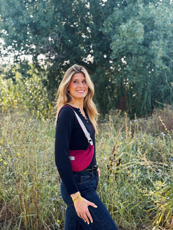 De lange, verstelbare schouderband van bordeauxrood katoen heeft aan één zijde een zilverkleurige lurex (glitter) voor een feestelijk accent. Je draagt de tas crossbody of stijlvol over de schouder - een chique finishing touch voor je outfit.