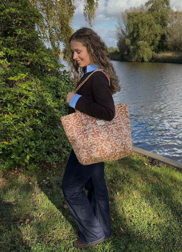 Deze grote shopper van De La Mur Line is uitgevoerd in een dikke jacquardstof met een beige ornamentmotief op een roestbruine achtergrond. De structuur en kleurcontrasten geven de stof een klassieke en barokke uitstraling.