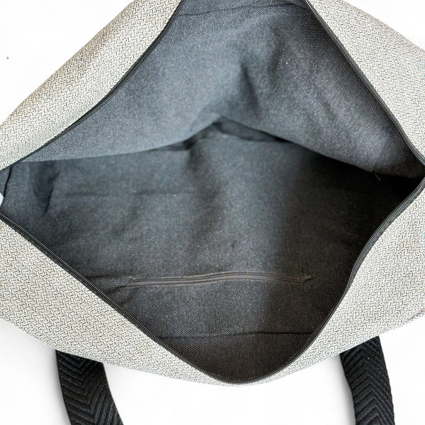 Deze stevige en ruime sporttas van de La Mur Line, ook wel duffeltas of duffle bag genoemd, is uitgevoerd in een dikke, effen grijze stof met visgraatpatroon.