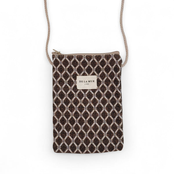 Dit leuke telefoontasje van de La Mur Line is uitgevoerd in een dikke jacquardstof met een geometrische print in bruintinten.