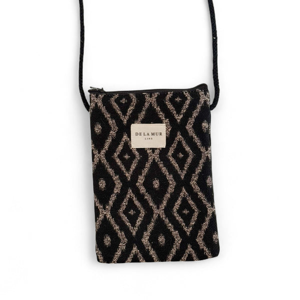 Dit leuke telefoontasje van de La Mur Line is uitgevoerd in een dikke jacquardstof met een beige, grafisch ruitpatroon op een diepzwarte achtergrond.