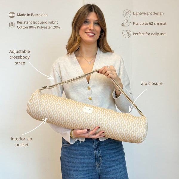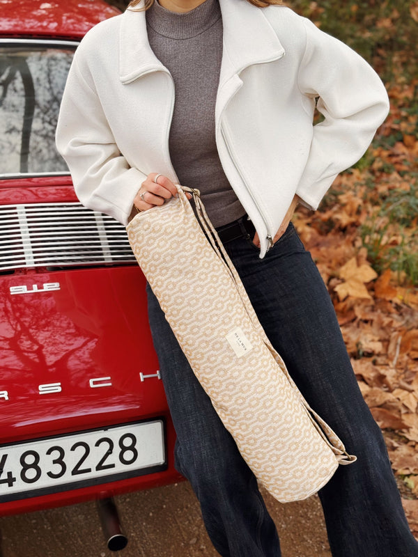 Deze yogamat tas van de La Mur Line is uitgevoerd in camelkleurige jacquardstof met een verfijnde geometrische print in crème.