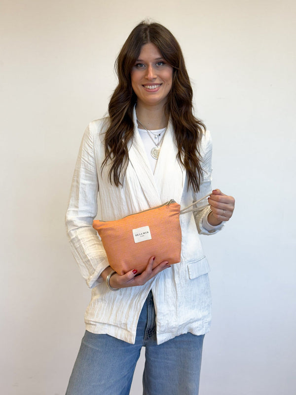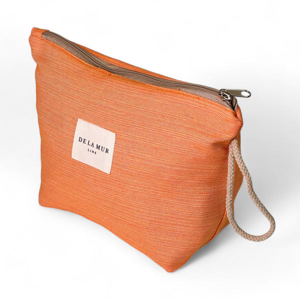 Diese Beauty-Bag aus der La Mur Line, auch Kosmetiktasche oder Make-up-Tasche genannt, ist ausgeführt in einem feinen orangen Stoff.