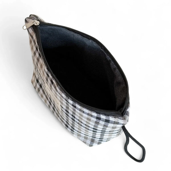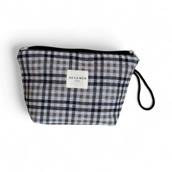 Diese Beauty Bag der La Mur Line, auch Kosmetiktasche oder Make-up-Tasche genannt, ist aus einem dicken Jacquardstoff mit einem Karomuster in Beige- und Schwarztönen gefertigt. Das Muster kann je nach Zuschnitt variieren.