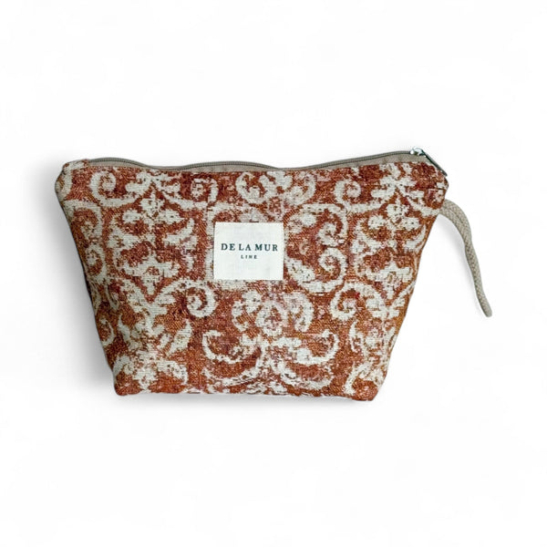 Diese Beauty Bag der La Mur Line, auch Kosmetiktasche oder Make-up-Tasche genannt, ist aus einem dicken Jacquardstoff gefertigt, der ein beiges Ornamentmuster auf rostbraunem Grund zeigt. Die Struktur und die Farbkontraste verleihen dem Stoff ein klassisches und barockes Aussehen. Jedes Stück kann je nach Zuschnitt im Muster variieren.