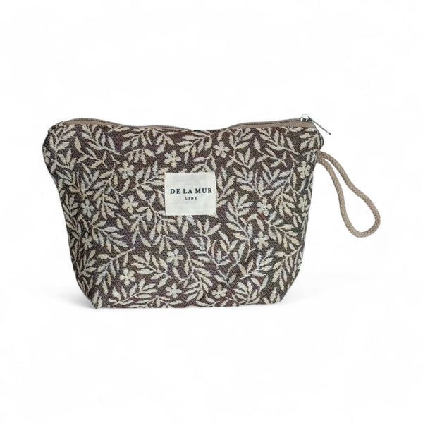 Diese Beauty Bag aus der La Mur Line, auch Kosmetiktasche oder Make-up-Tasche genannt, ist aus einem dicken Jacquardstoff mit einem cremefarbenen Blumenmuster auf braunem Hintergrund gefertigt. Jedes Stück kann je nach Zuschnitt im Muster variieren.