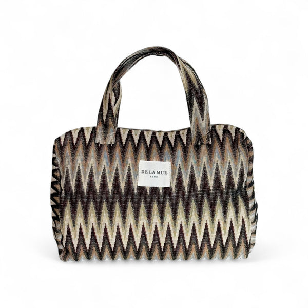 Diese extra große Beauty Bag der La Mur Line, auch Kosmetiktasche oder Make-up-Tasche genannt, ist aus einem dicken Jacquardstoff mit Zickzackmuster in Erdtönen wie Beige, Braun, Sand und Schwarz gefertigt. Das Muster kann je nach Zuschnitt variieren.