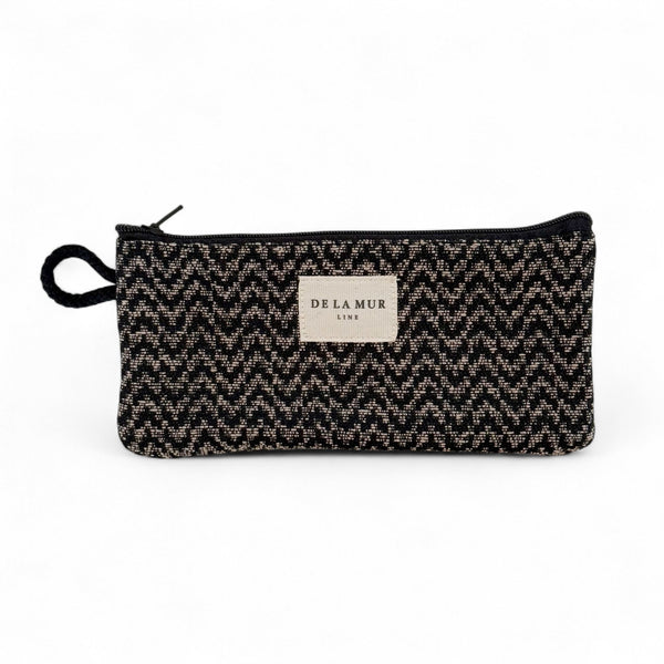 Dieses hübsche Brillenetui von La Mur Line, auch Brillenbox oder Brillenbeutel genannt, ist aus einem dicken Jacquardstoff mit einem Zickzackmuster in Schwarz und Beige gefertigt.