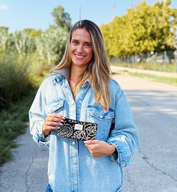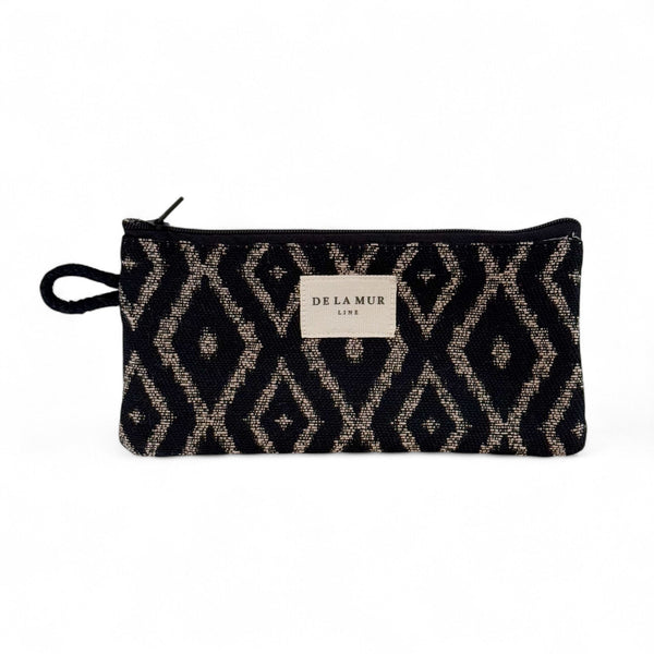 Dieses hübsche Brillenetui von La Mur Line, auch Brillenbox oder Brillenbeutel genannt, ist aus einem dicken Jacquardstoff mit einem beigen, grafischen Karomuster auf tiefschwarzem Hintergrund gefertigt. Jedes Stück kann je nach Zuschnitt im Muster variieren.
