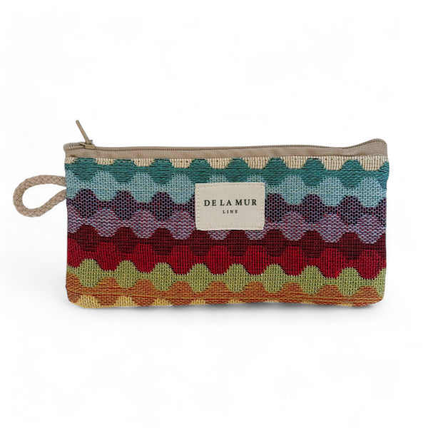 Dieses hübsche Brillenetui der La Mur Line, auch Brillenbox oder Brillenbeutel genannt, ist aus einem dicken Jacquardstoff gefertigt und zeigt ein rhythmisches, wellenförmiges Muster in farbenfrohen Streifen. Warme Töne wie Rost, Ocker, Türkis und Aubergine wechseln sich spielerisch ab. Jedes Stück kann je nach Zuschnitt im Muster variieren.