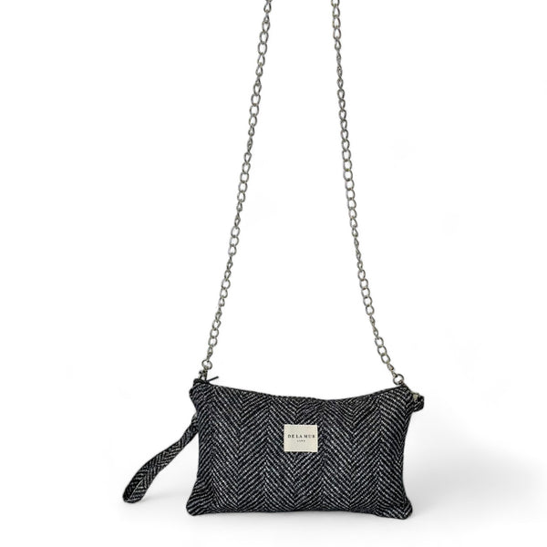 Dit charmante handtasje van de La Mur Line, ook wel avondtasje genoemd, is gemaakt van een fijn stof met een donkergrijs visgraatpatroon.