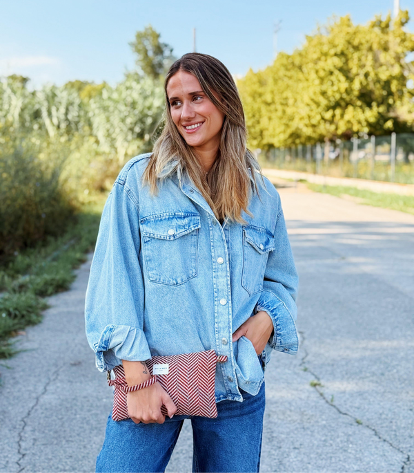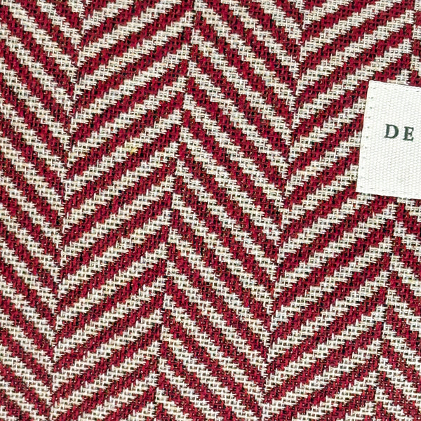Diese charmante Handtasche aus der La Mur Line, auch Abendtasche genannt, ist gefertigt aus einem dicken Jacquardstoff mit weinrotem Fischgrätmuster.