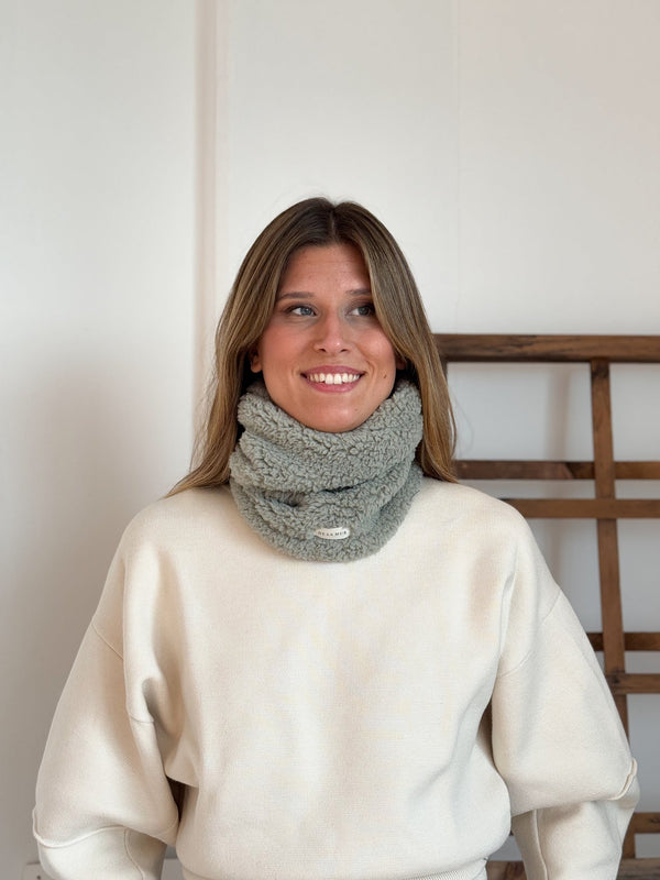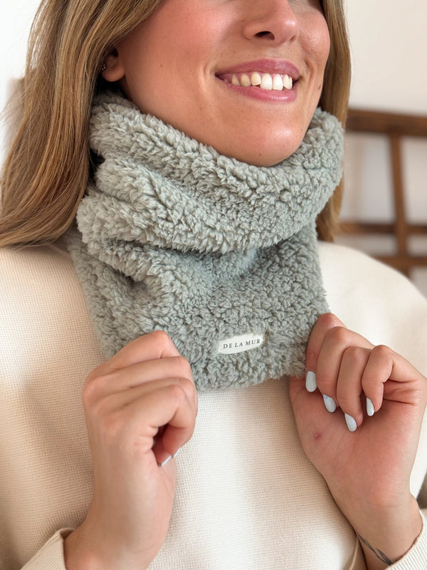 Dieser Schlauchschal von La Mur Line ist aus einem hellgrünen Teddy-Stoff gefertigt.
