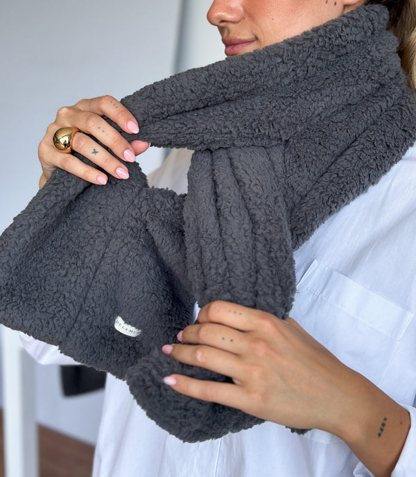 Dieser Schlauchschal von La Mur Line ist aus einem dunkelgrauen Teddy-Stoff gefertigt.