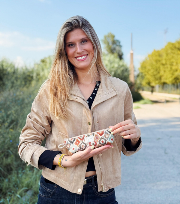 Dieses elegante Etui ist gefertigt aus einem robusten Jacquardstoff mit einem feinen Karomuster in Rostbraun, Rot-Orange, Olivgrün, Beige und Hellblau. Der gewebte Effekt verleiht dem Design zusätzliche Tiefe. Jedes Stück kann je nach Zuschnitt im Muster variieren.