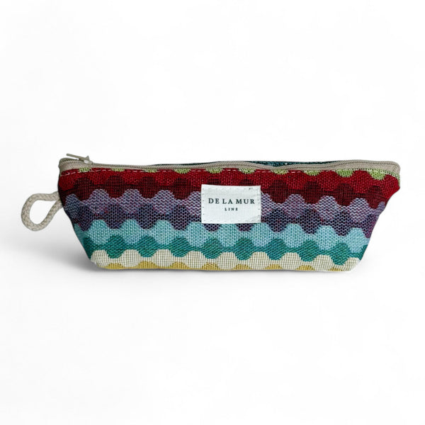 Dieses elegante Etui ist gefertigt aus einem dicken Jacquardstoff mit einem rhythmischen, wellenförmigen Muster in farbenfrohen Bahnen. Warme Farbtöne wie Rost, Ocker, Türkis und Aubergine wechseln sich spielerisch ab. Jedes Stück kann je nach Zuschnitt im Muster variieren.