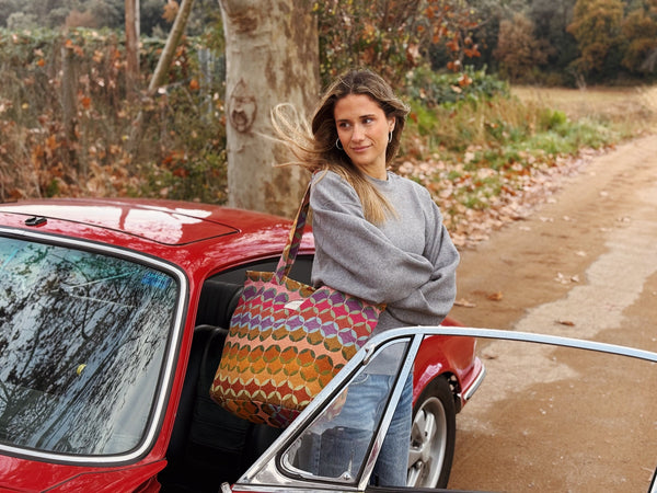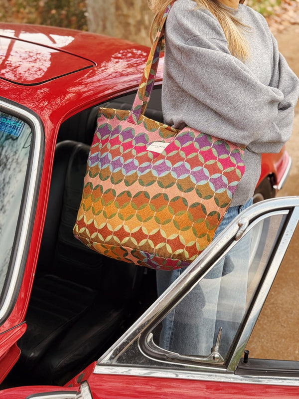 Diese große Einkaufstasche von De La Mur Line ist aus Jacquard-Stoff mit einem mehrfarbigen geometrischen Muster gefertigt.