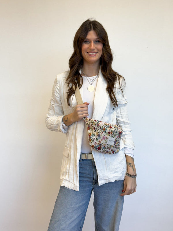 Das Must-Have in Ihrer Taschensammlung: die Gürteltasche! Diese trendige Hüfttasche aus der La Mur Linie, auch Fanny Pack genannt, ist aus dickem Jacquardstoff mit mehrfarbigem Blumendruck auf beigem Hintergrund.