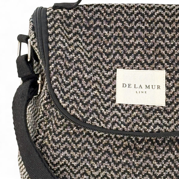 Diese stilvolle Lunchtasche von De La Mur Line ist aus einem dicken Jacquardstoff mit einem Zickzackmuster in Schwarz und Beige gefertigt.