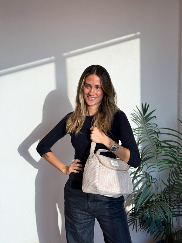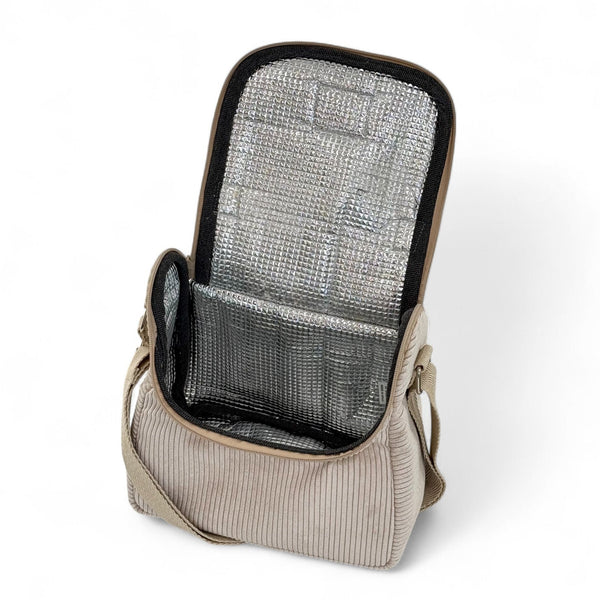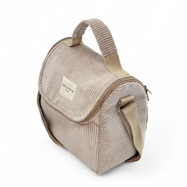 Diese stilvolle Lunchtasche von De La Mur Line ist aus beigefarbenem Cord-Rippstoff gefertigt.
