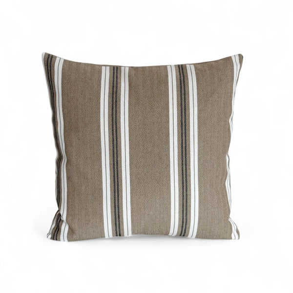 Dieser Kissenbezug von De La Mur Line besteht aus zwei wunderschönen Stoffen: Auf der einen Seite ein dicker Stoff mit einem Streifenmuster in Hellbraun und Weiß, und auf der anderen Seite ein einfarbiger, juteartiger Stoff.