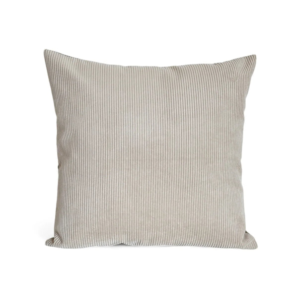 Dieser Kissenbezug von De La Mur Line ist aus zwei wunderschönen Stoffen gefertigt: auf der einen Seite ein beigefarbener Cordstoff mit Rippenstruktur und auf der anderen Seite ein schlichter, juteähnlicher Stoff.