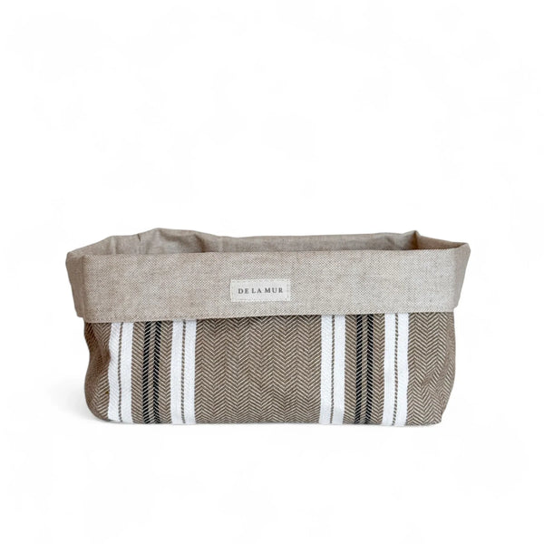 Dieser Aufbewahrungskorb von De La Mur Line besteht aus einem dicken Stoff mit einem hellbraun-weißen Streifenmuster. Die Innenseite ist mit einer beschichteten Schicht versehen, die leicht zu reinigen ist.