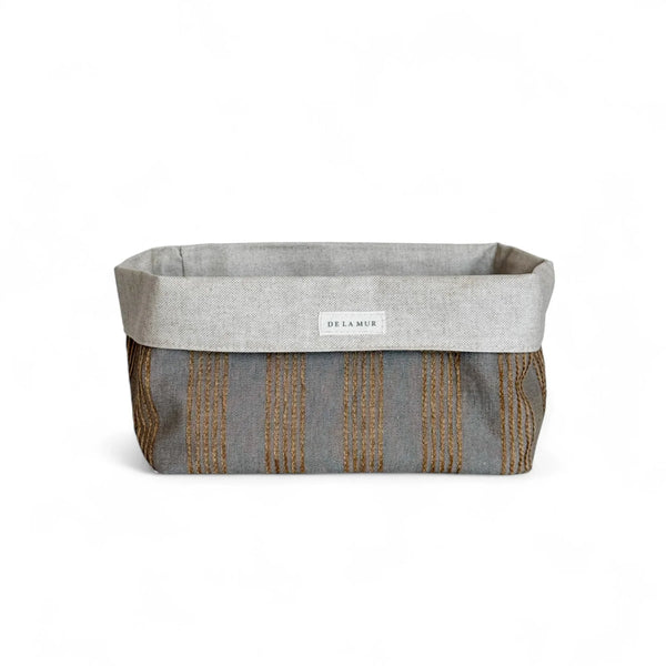 Dieser Aufbewahrungskorb von De La Mur Line besteht aus einem Chenille-Stoff mit einer juteartigen Struktur und kupferfarbenen Streifen. Die Innenseite ist mit einer beschichteten Schicht versehen, die leicht zu reinigen ist.