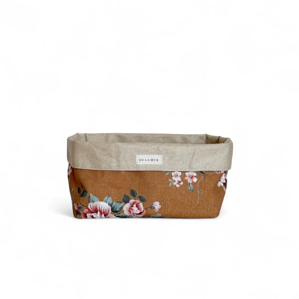 Dieser Aufbewahrungskorb von De La Mur Line besteht aus einem Halbpanama-Gewebe mit Blumenmuster auf orangebraunem Hintergrund. Die Innenseite ist mit einer beschichteten Schicht versehen, die leicht zu reinigen ist.