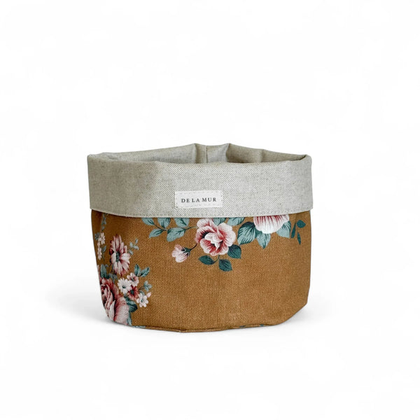 Dieser Aufbewahrungskorb von De La Mur Line besteht aus einem Halbpanama-Gewebe mit Blumenmuster auf orangebraunem Hintergrund. Die Innenseite ist mit einer beschichteten Schicht versehen, die leicht zu reinigen ist.