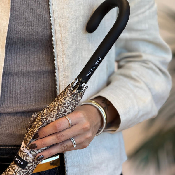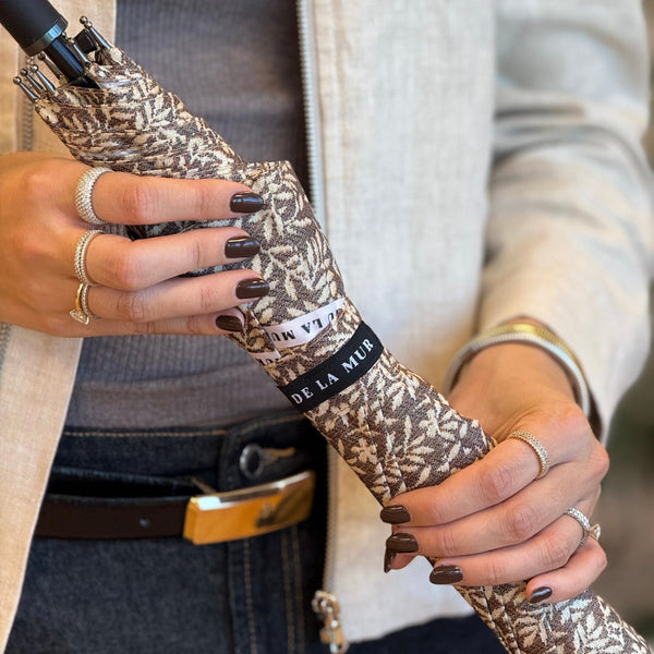 Dieser elegante Regenschirm von De La Mur Line ist mit einem cremefarbenen Blumenmuster auf braunem Hintergrund versehen. Er ist im gleichen Design wie unsere Taschen und Accessoires gehalten, sodass Sie auch bei Regen immer perfekt gestylt aus dem Haus gehen.