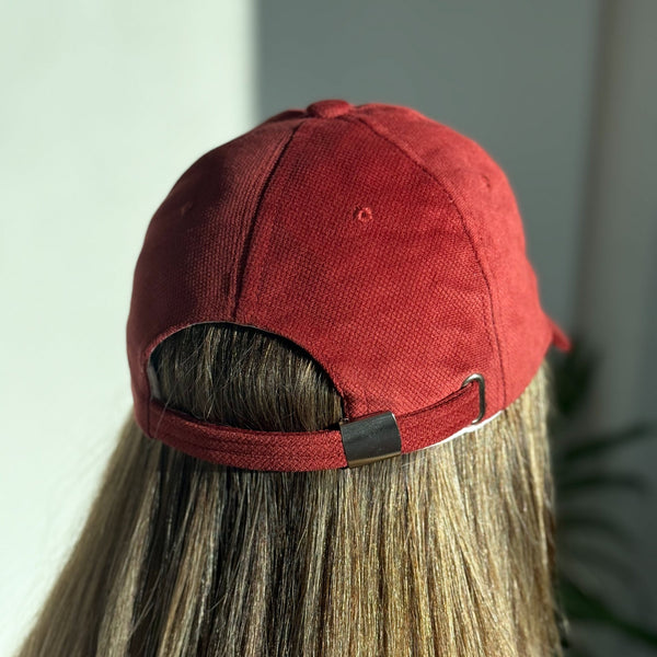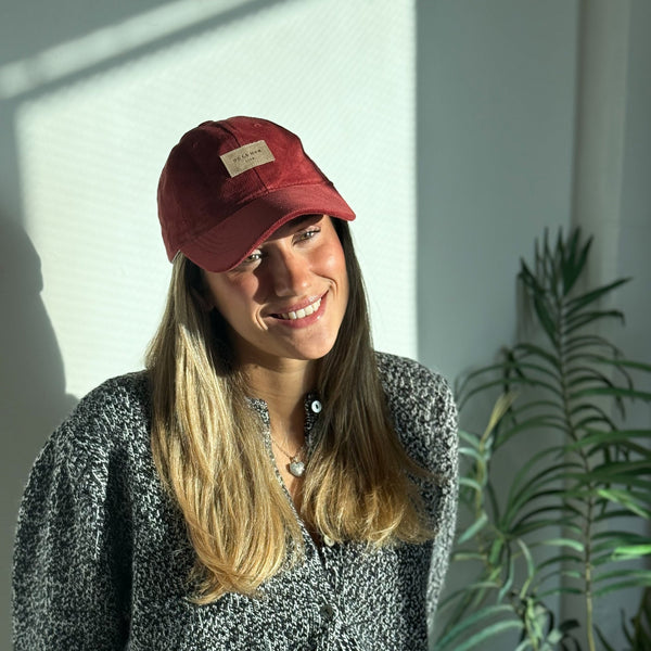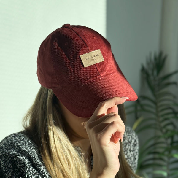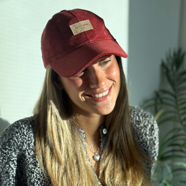 Diese charakteristische Mütze von De La Mur Line ist aus bordeauxrotem Samt gefertigt und mit einem beigefarbenen Etikett versehen.