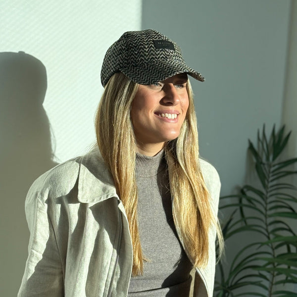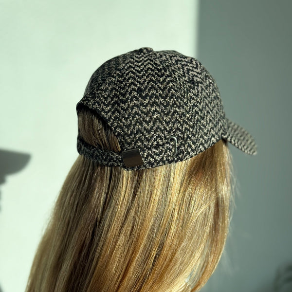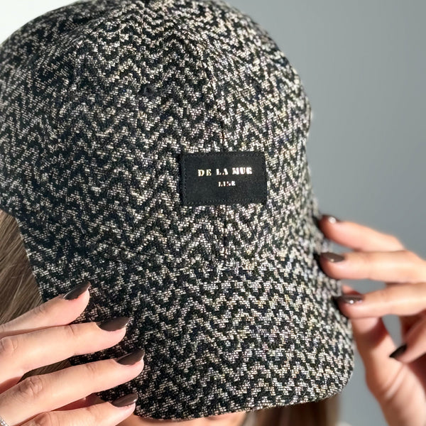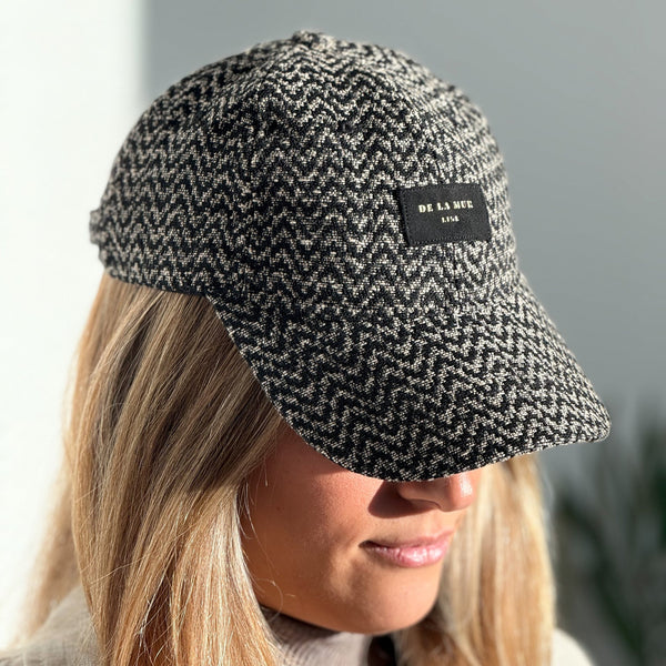 Diese charakteristische Mütze von De La Mur Line ist in einem schwarz-beigen Zickzackmuster gehalten.