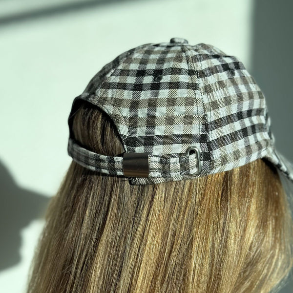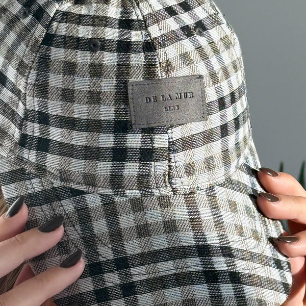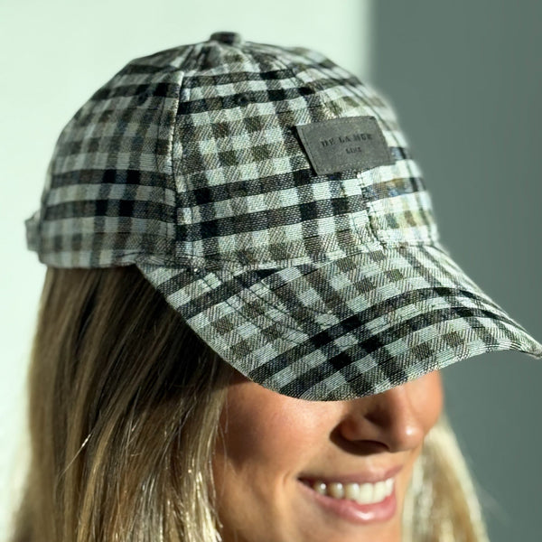 Diese charakteristische Mütze von De La Mur Line ist in einem schwarz-beigen Karomuster gehalten.