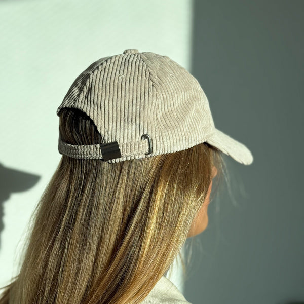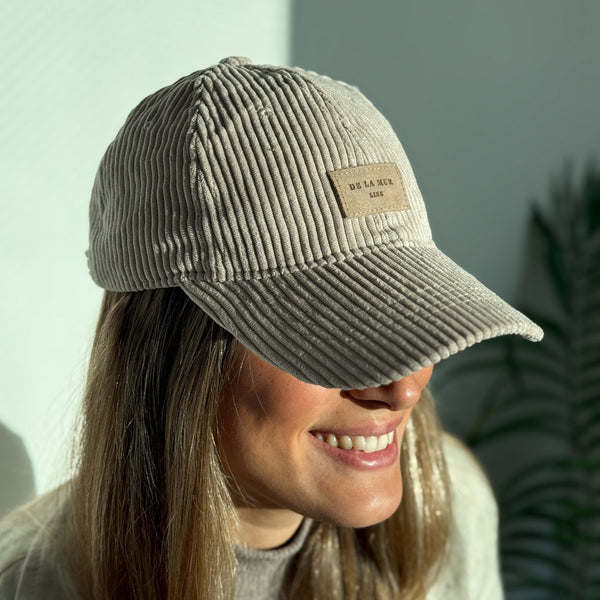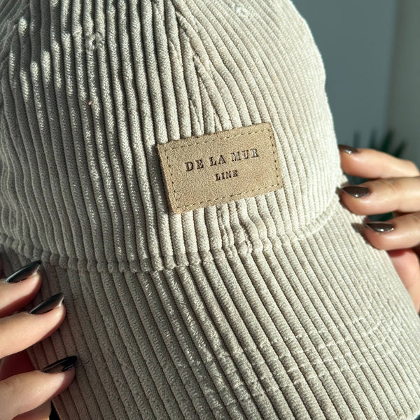 Diese charakteristische Mütze von De La Mur Line ist aus beigefarbenem Cord-Rippstoff gefertigt und mit einem kamelfarbenen Etikett versehen.