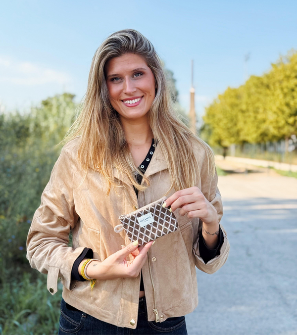 Dieses hübsche Portemonnaie aus der La Mur Line ist aus einem dicken Jacquardstoff mit einem geometrischen Muster in Brauntönen gefertigt. Jedes Stück kann je nach Zuschnitt im Muster variieren.