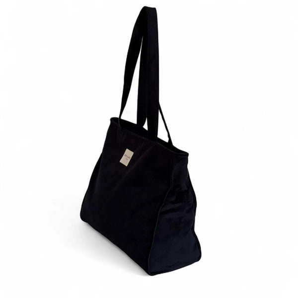 Dieser rechteckige Shopper von De La Mur Line ist aus dickem, schwarzem Samt gefertigt.