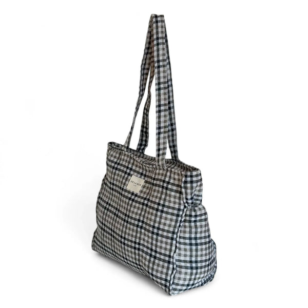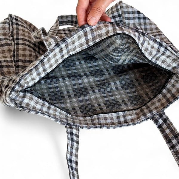Dieser rechteckige Shopper von De La Mur Line ist aus einem dicken Jacquardstoff mit einem Karomuster in Beige- und Schwarztönen gefertigt.