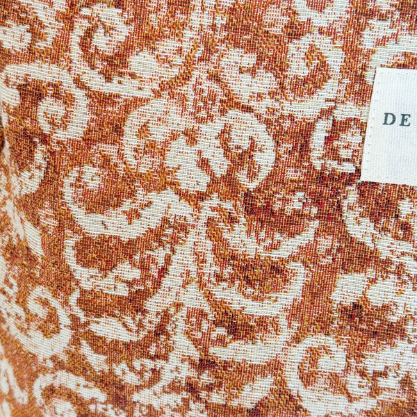 Dieser rechteckige Shopper von De La Mur Line ist aus einem dicken Jacquardstoff gefertigt, der ein beiges Ornamentmuster auf rostbraunem Grund zeigt. Die Struktur und die Farbkontraste verleihen dem Stoff ein klassisches und barockes Aussehen.