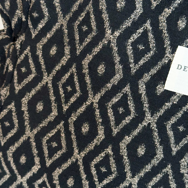 Dieser rechteckige Shopper von De La Mur Line ist aus einem dicken Jacquardstoff gefertigt, der ein beiges, grafisches Karomuster auf tiefschwarzem Hintergrund aufweist.